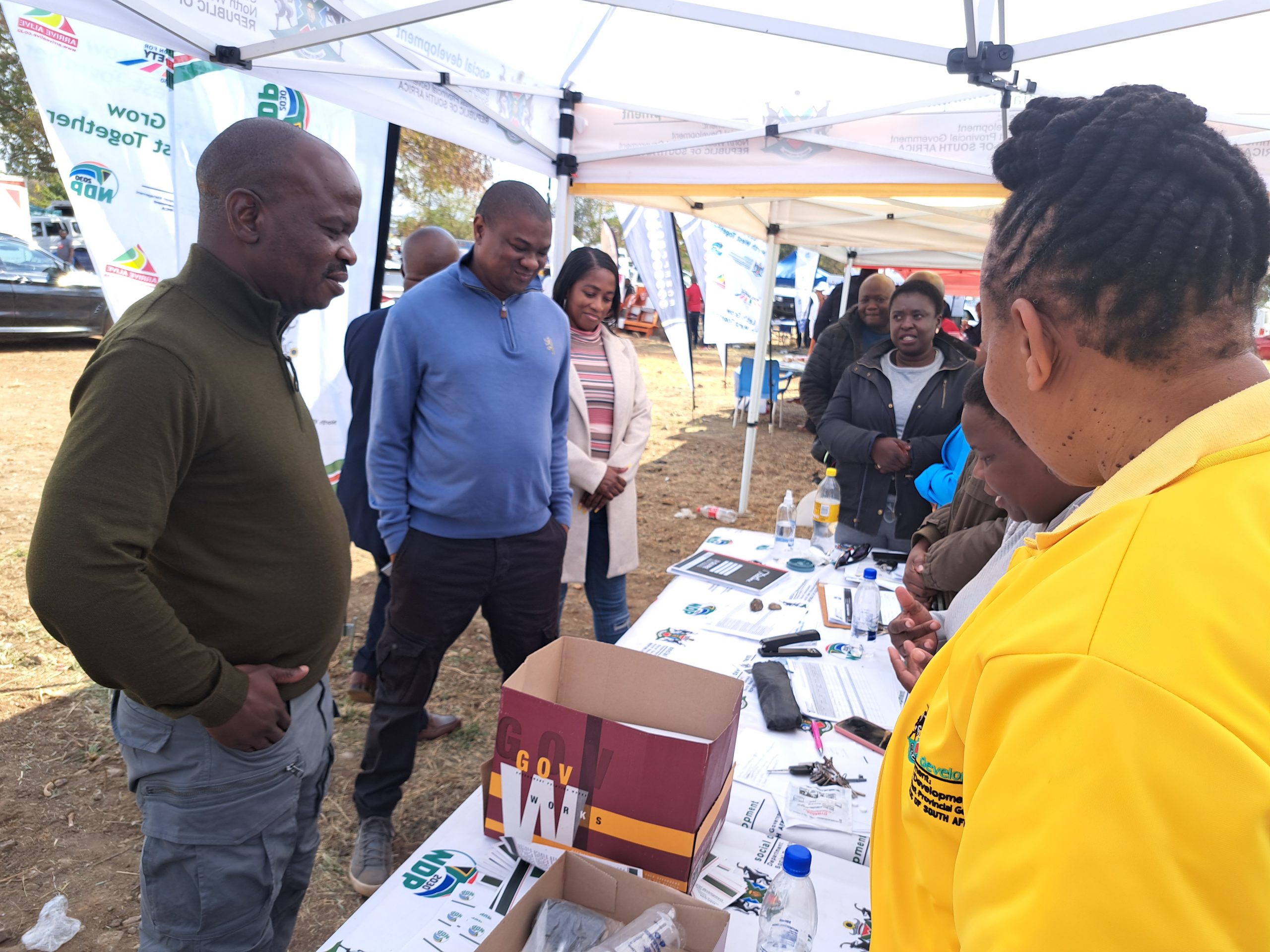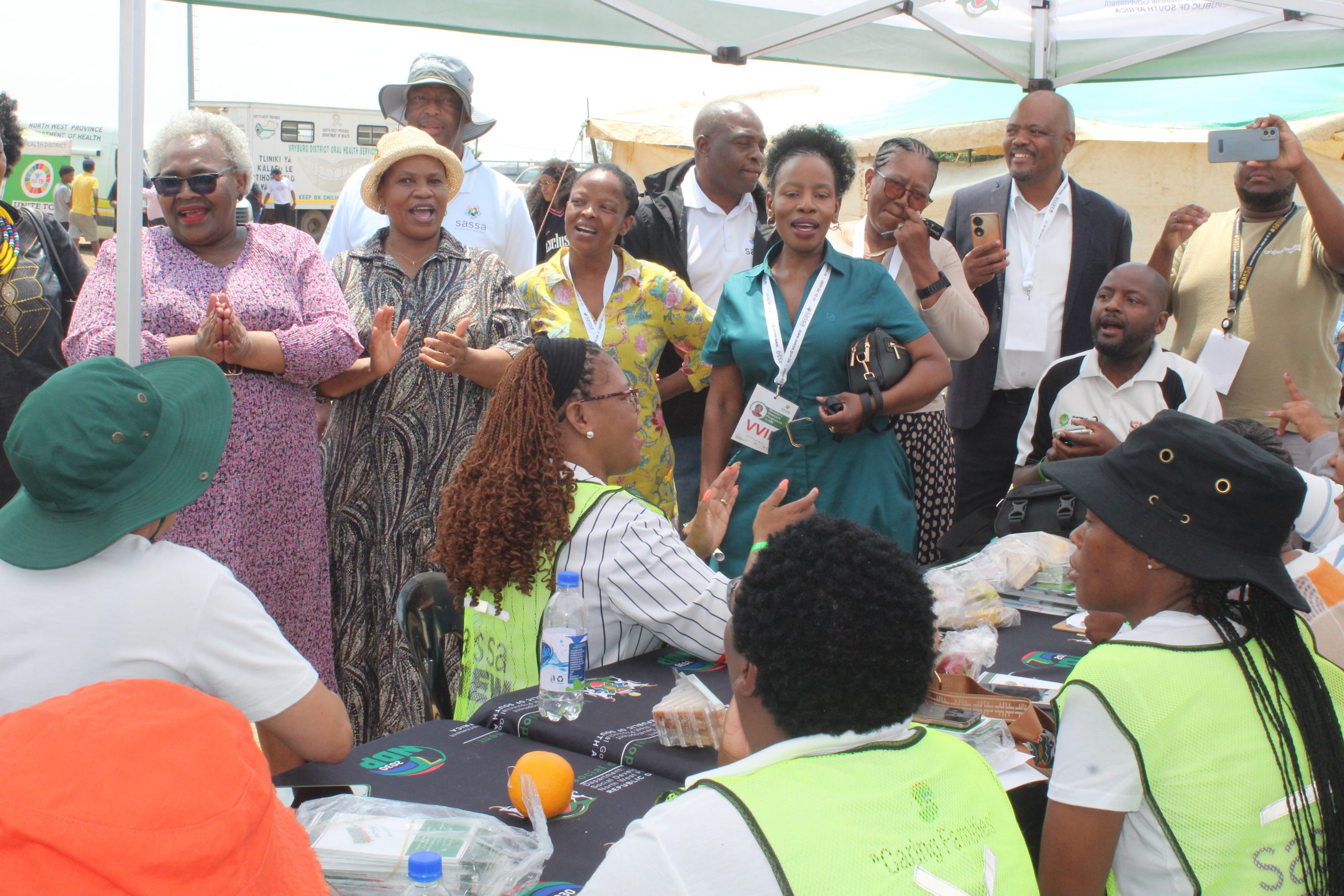 Minister Tolashe and her entourage interacts with social workers as part of exhibition stalls walkabout during the ministerial outreach programme in Huhudi near Vryburg.