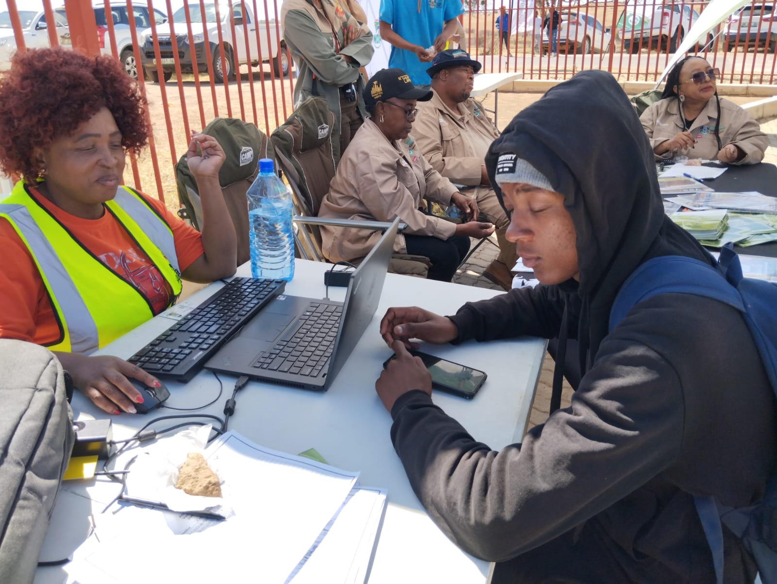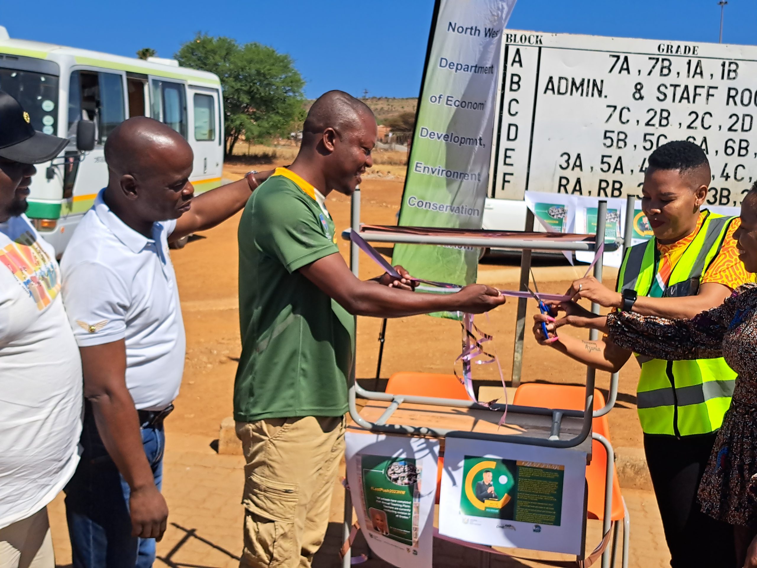 MEC Mokgosi (second from left) with Education MEC Viola Motsumi (wearing reflector) handing over chairs and desks to schools, as part of the Thuntsha Lerole accelerated service delivery programme in Borolelo outside Swartruggens. The two are part of the government's social cluster