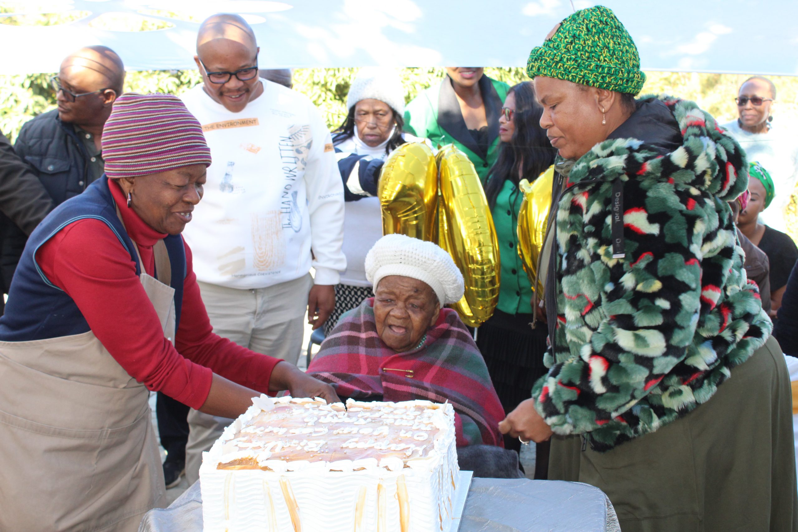 North West Social Development MEC Sussana Dantjie and Kgomotso Diale (caregiver) cut the cake at the birthday celebration of a Phokeng centenarian, Annah Diale on Saturday