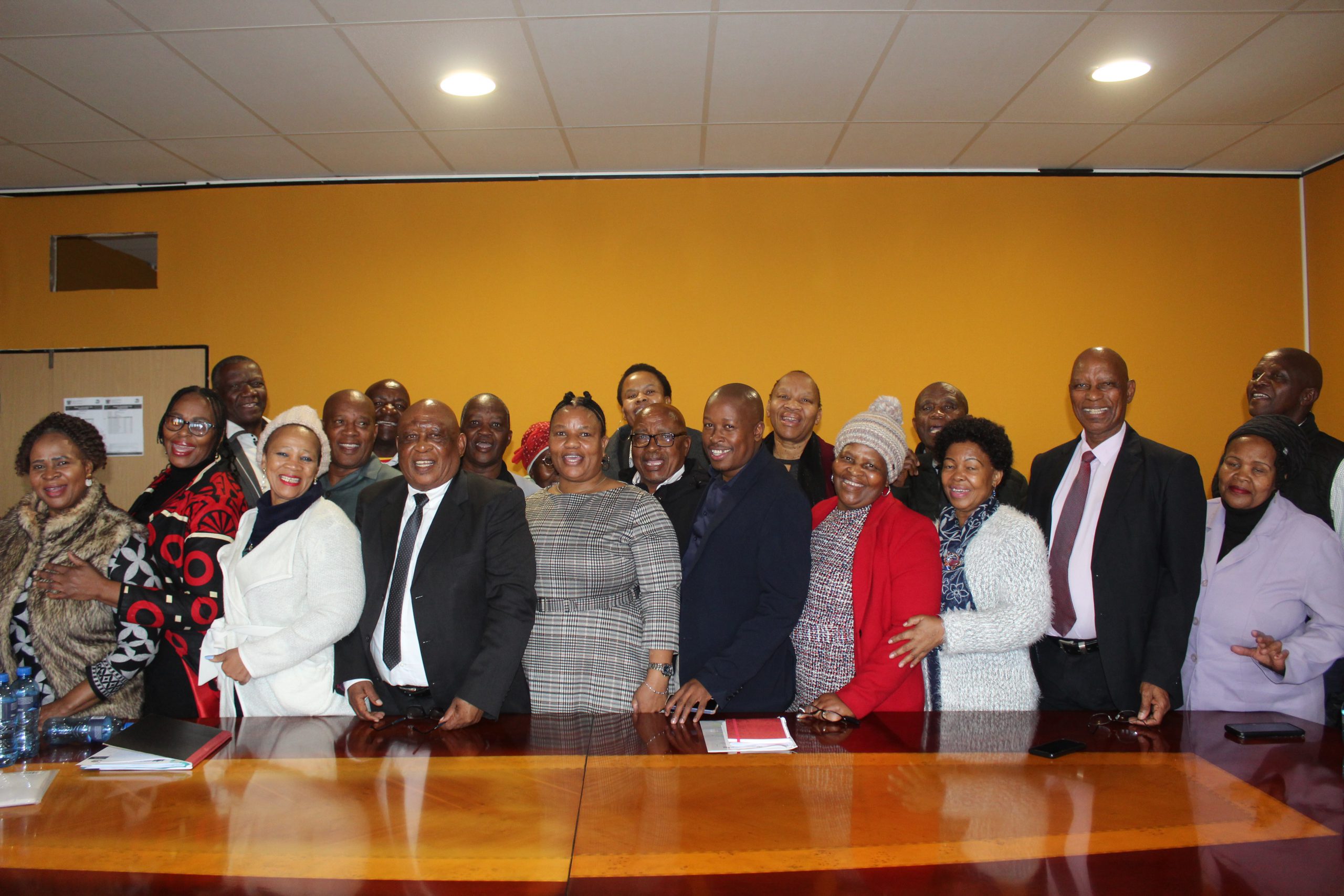 North West Social Development MEC Dantjie (5th from the left, front row) and senior officials during a meet and greet session with an Older Persons Forum delegation