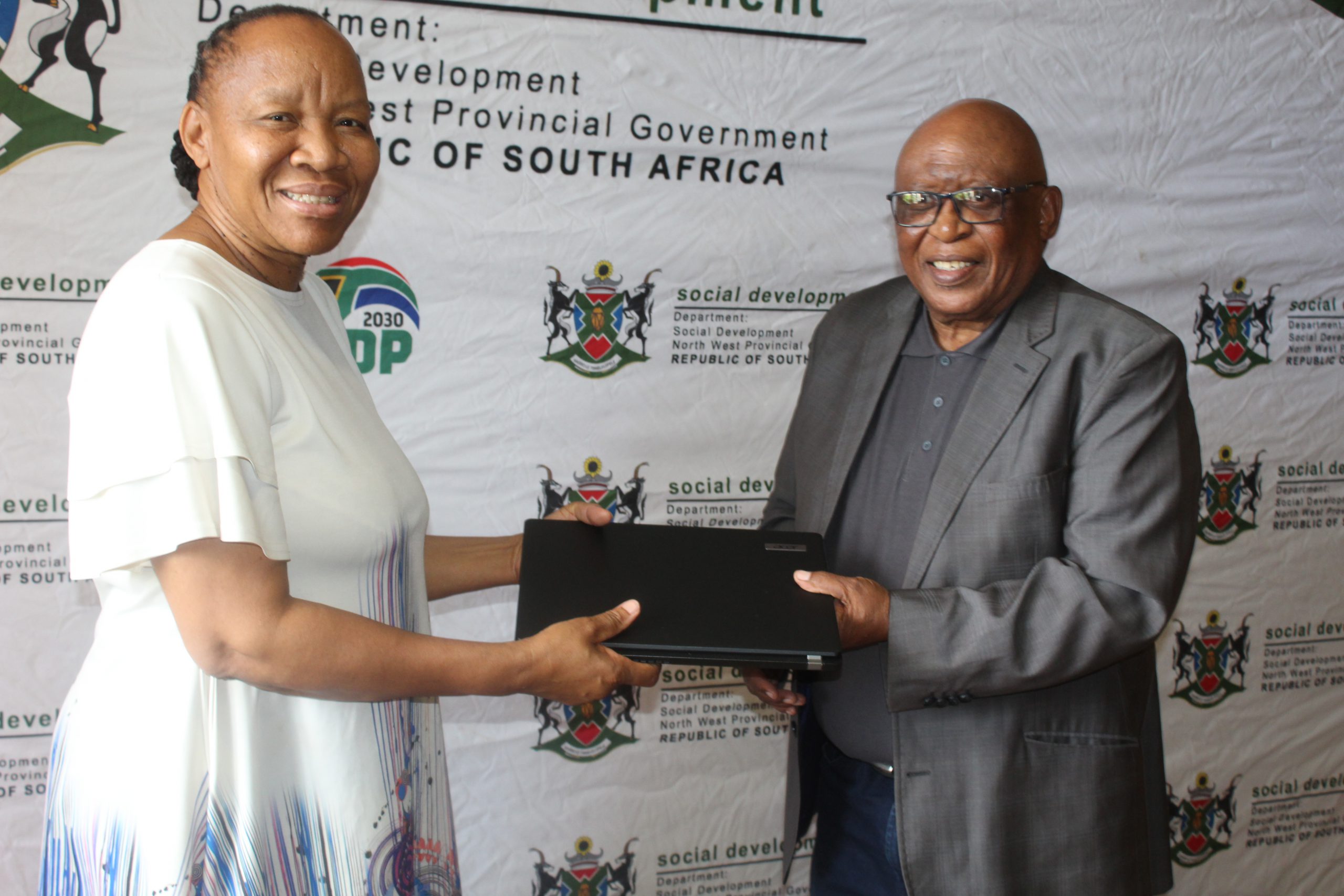Acting Head of Department Masego Mekgwe handing over a laptop to North West Older Persons Forum representative, Mr Sehularo.