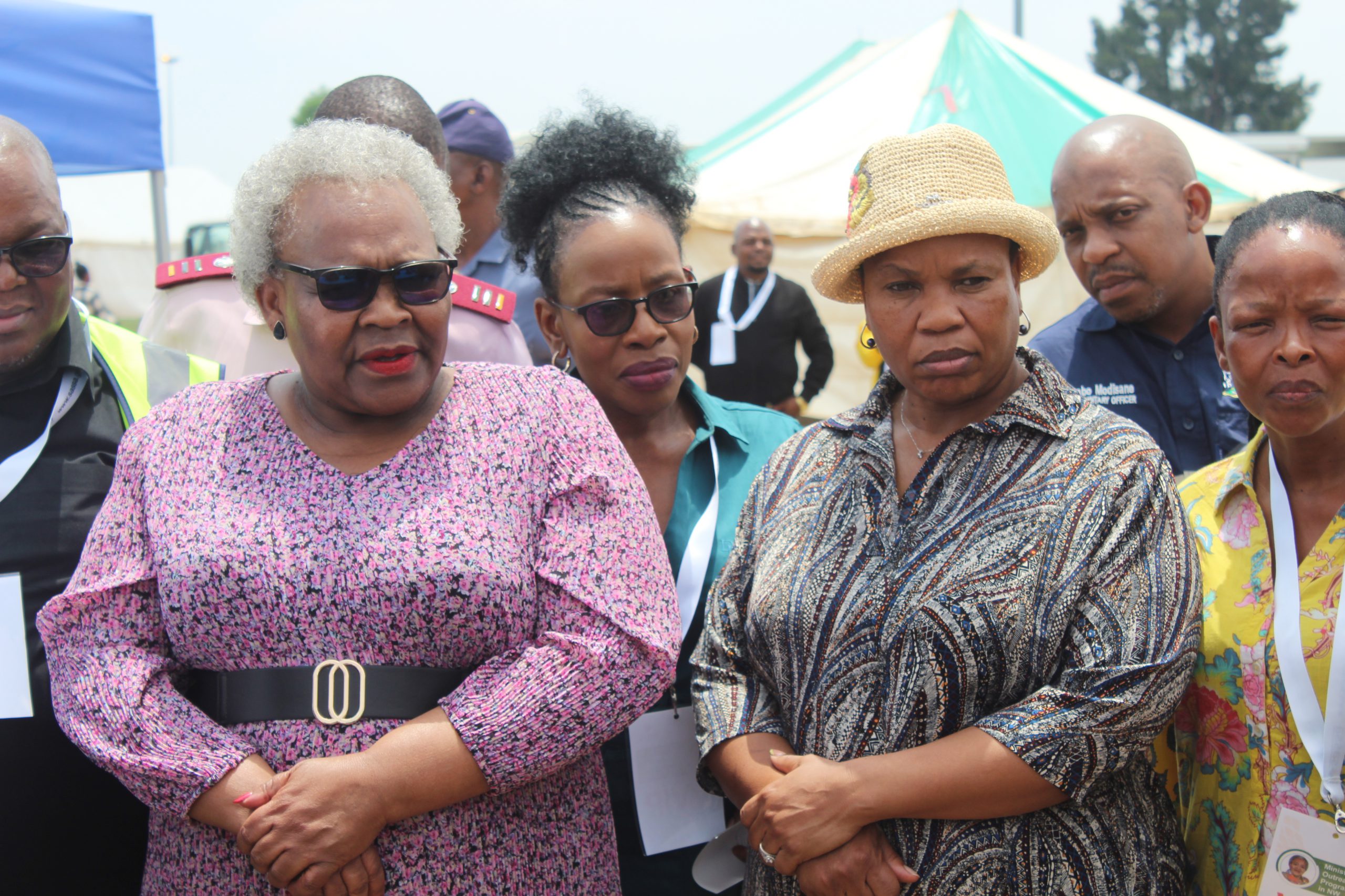 Minister of Social Development Sisisi Tolashe (second from left), alongside MEC for Social Development, Sussana Dantjie (brown hat) and Acting HOD, Peggy Mhlongo- Kgaboesele visi.ting exhibition stalls during Minister's outreach programme held in Huhudi near Vryburg.