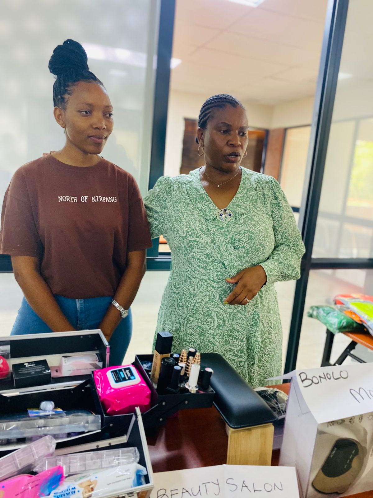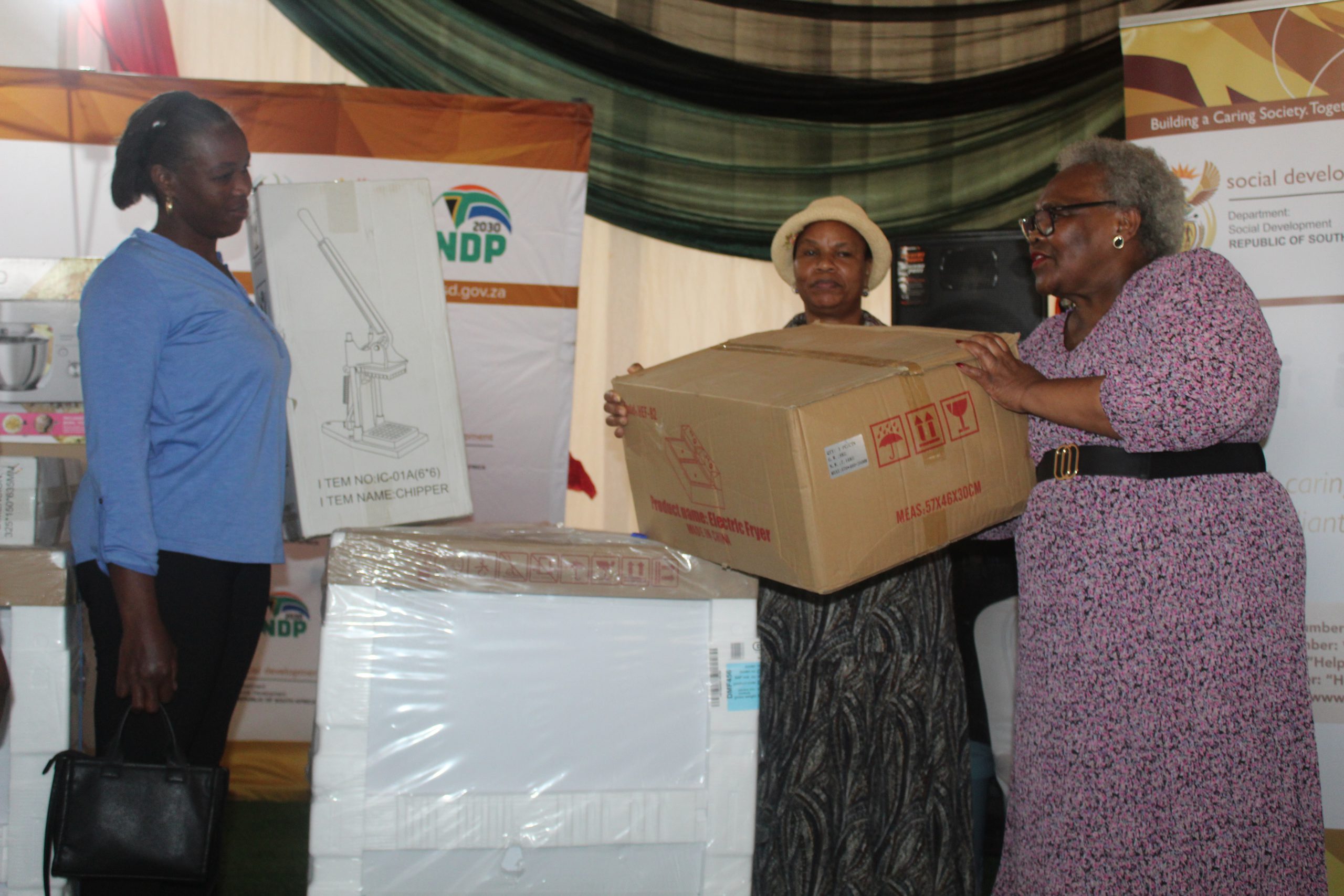 Minister Sisisi Tolashe and MEC Sussana Dantjie handover support material to three deserving women as part of the small business women empowerment during the ministerial outreach programme event held in Huhudi near Vryburg.